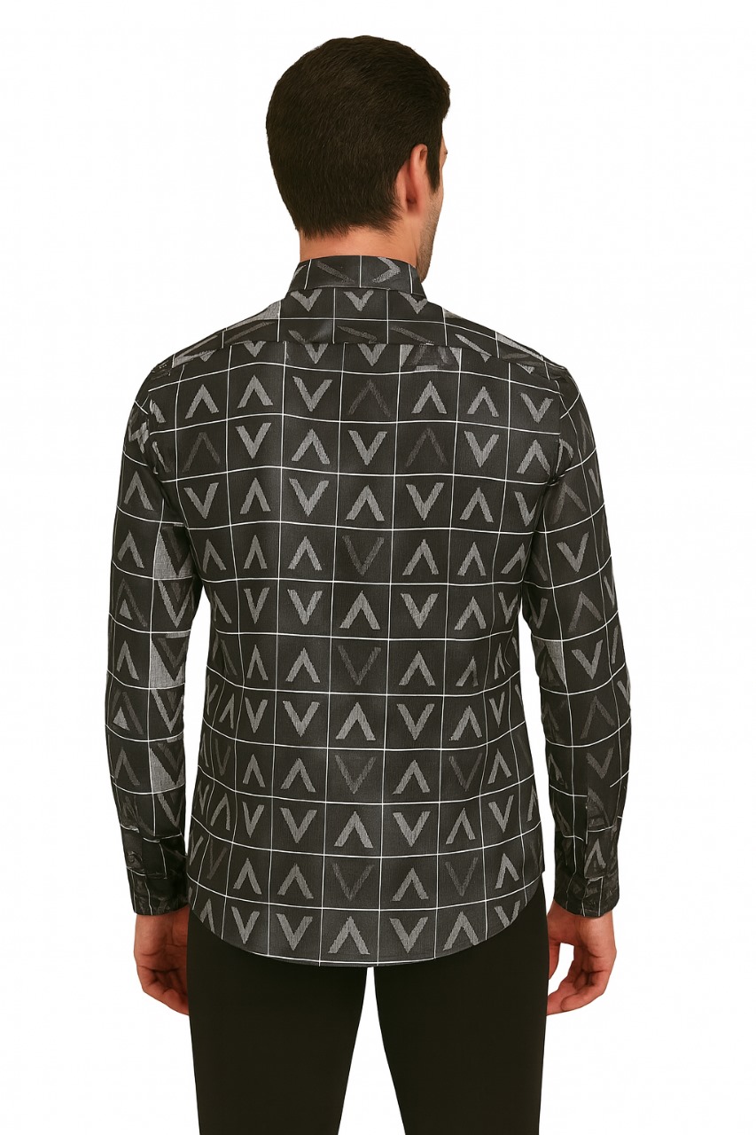 Make a bold fashion statement with this Men’s Black Printed Long Sleeve Shirt, designed with an eye-catching geometric grid and triangle print. The sharp contrast of grey patterns on a charcoal black base brings a contemporary edge to your wardrobe. Crafted from premium cotton blend fabric, this shirt ensures breathability, comfort, and durability.