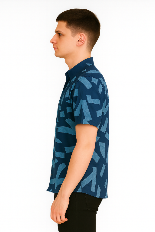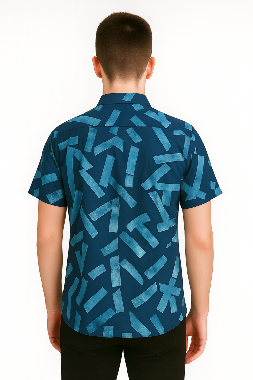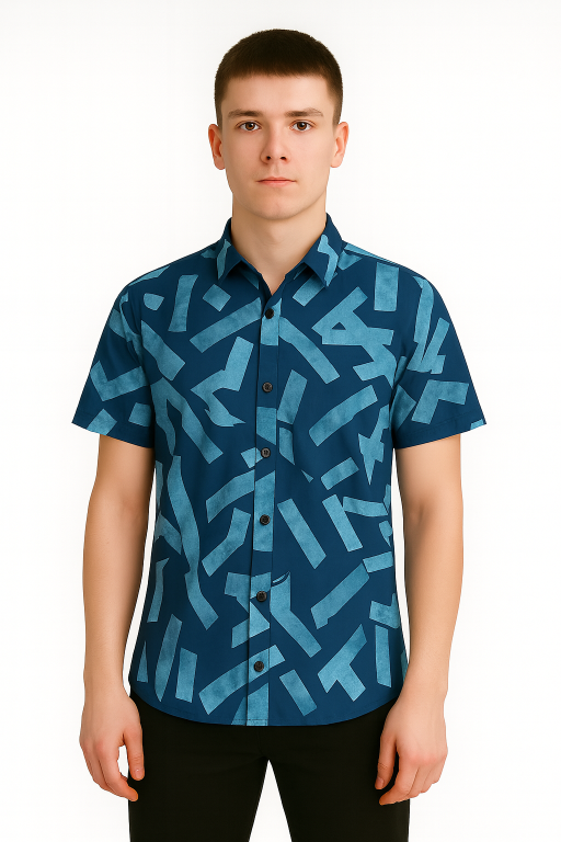 This Men’s Navy Blue Printed Casual Shirt is designed to make a statement with its vibrant color combination and modern print. The bold light teal blue geometric patterns over a rich navy base bring a trendy, youthful vibe.